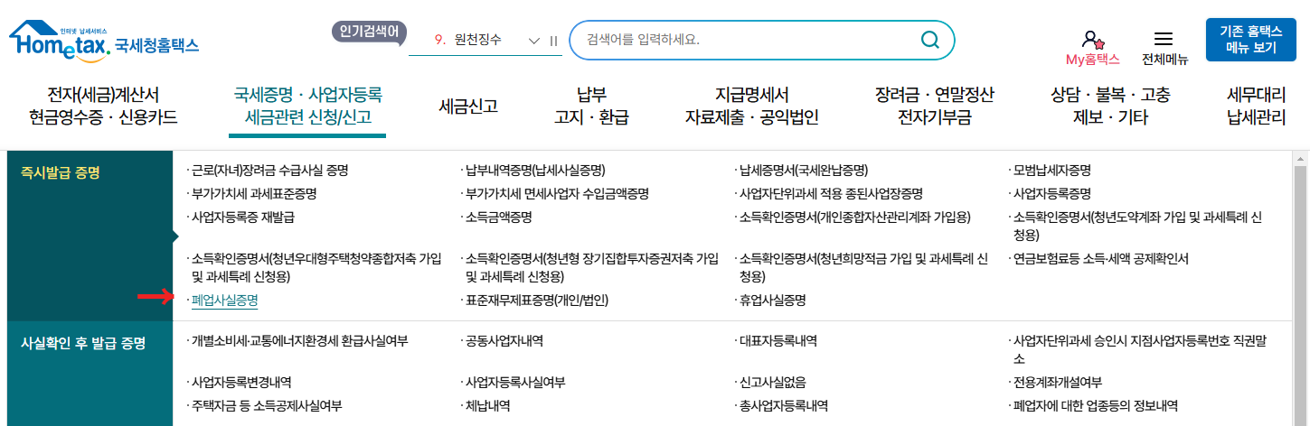 - 그 다음 '폐업사실증명'을 선택합니다.