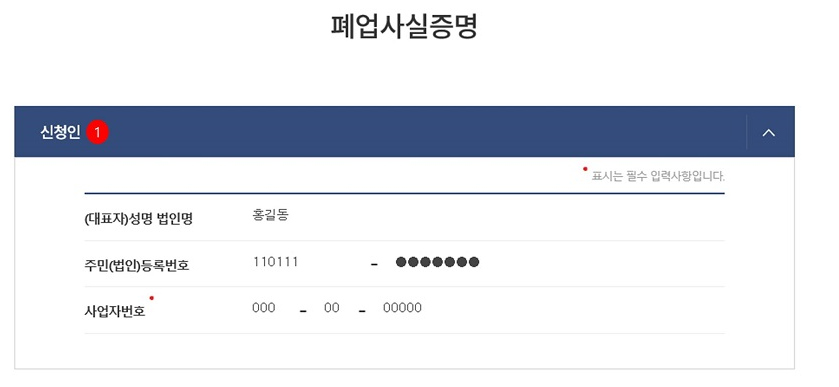 사업자등록번호, 폐업일자 등의 정보를 정확히 입력해야 합니다.